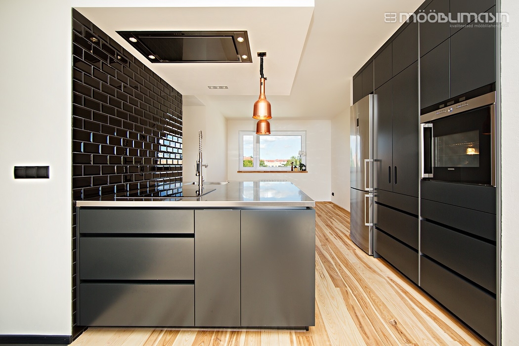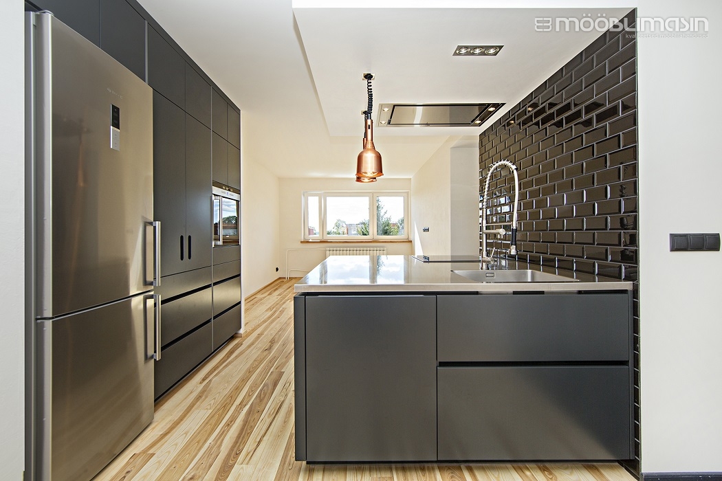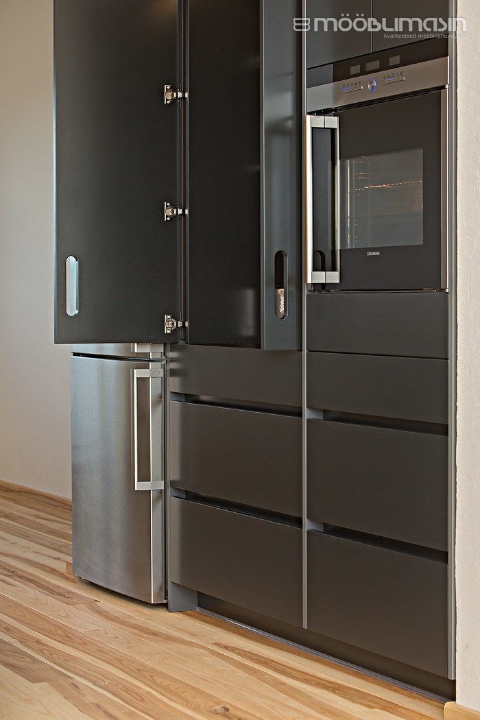 Esipaneelid (saarel, kõrgetel kappidel, seinakappidel): MDF (uksetüüp Monte), poolmatt värv (toon NCS S 3000-N).